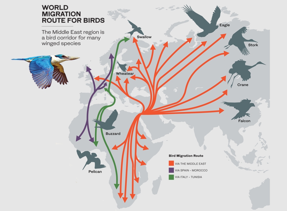 Персидский залив расположен вдоль основных миграционных путей, связывающих Европу, Центральную Азию, Африку и Южную Азию. Болота и прибрежные местообитания в регионе служат важными местами отдыха и кормления для птиц, мигрирующих между этими континентами.